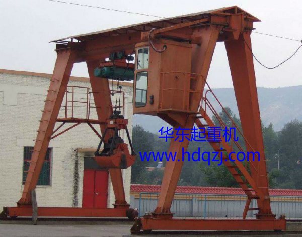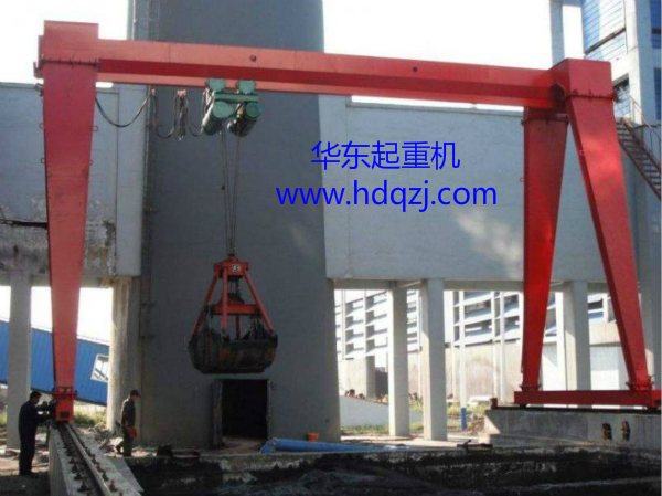 MH型單梁抓斗門式起重機是根據JB/T5663-2008 《電動葫蘆門式起重機》生產制作,與兩臺電動葫蘆(特制鋼架將兩臺電動葫蘆固定一起使用)及抓斗配套使用,是一般用途有軌運行的中小型起重機。