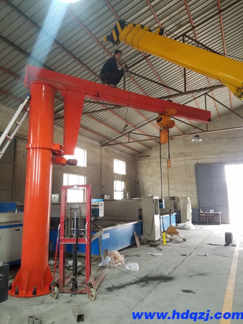 懸臂吊起重機工作強度為輕型,起重機由立柱,回轉臂回轉驅動裝置及電動葫蘆組成,立柱下端通過地腳螺栓固定在混凝土基礎上,由擺線針輪減速裝置來驅動懸臂回轉,電動葫蘆在懸臂工字鋼上作左右直線運行,并起吊重物。起重機旋臂為空心型鋼結構,自重輕,跨度大,起重量大,經濟耐用。內置式行走機構,采用帶滾動軸承的特種工程塑料走輪,摩擦力小,行走輕快;結構尺寸小,特別有利于提高吊鉤行程。
