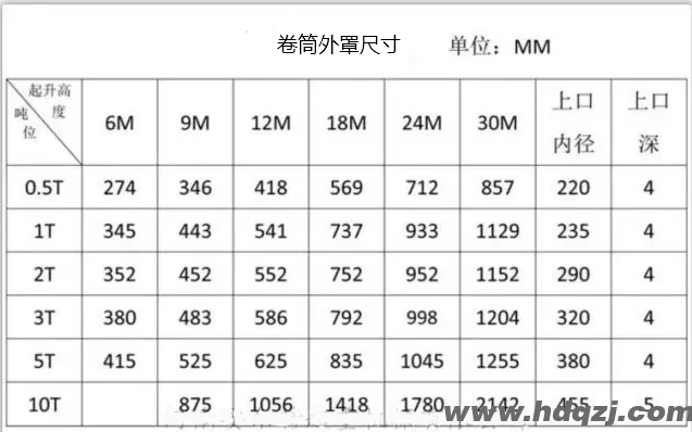 電動葫蘆卷筒的起重量主流的有5t、1t、2t、3t、5t、10t、16t等,對應(yīng)的卷筒外罩的具體型號如下: